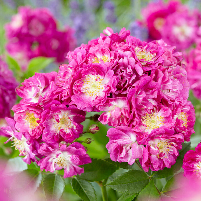 Trossen violet-paarse bloemen met goudgele meeldraden, op een krachtige rambler.