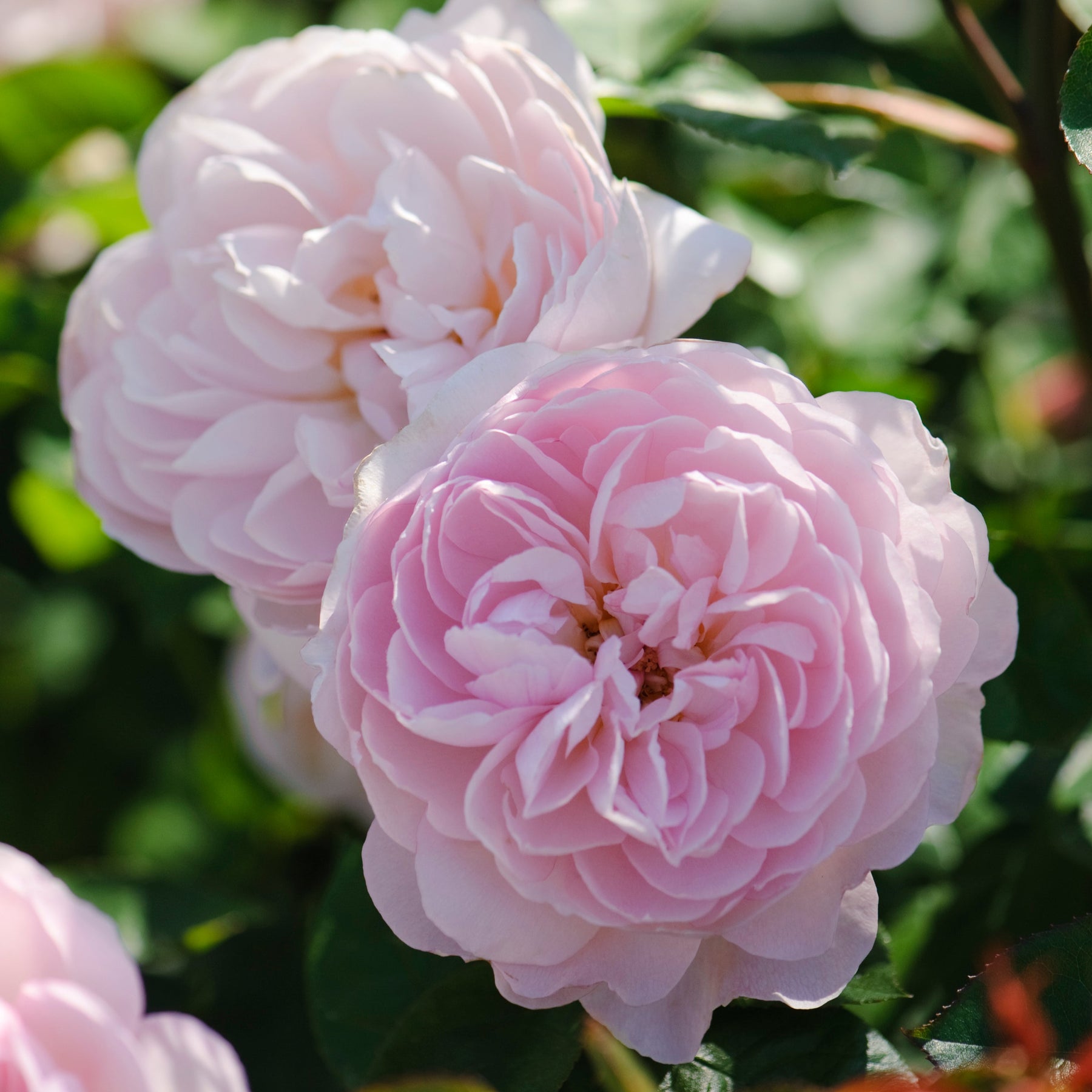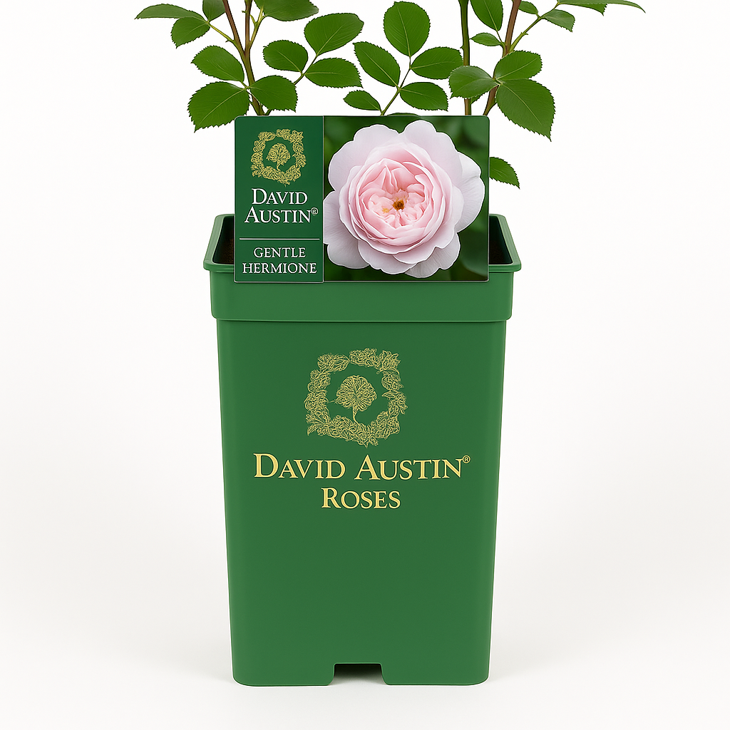 De Gentle Hermione roos produceert grote, volledig dubbele rozetbloemen tot wel 10 cm breed. Hun puur roze kleur met subtiele blos aan de buitenzijde geeft de bloemen een verfijnde, romantische uitstraling. Met ca. 90 bloemblaadjes per bloem en een sterke klassieke rozengeur is deze variëteit geliefd onder rozenliefhebbers.