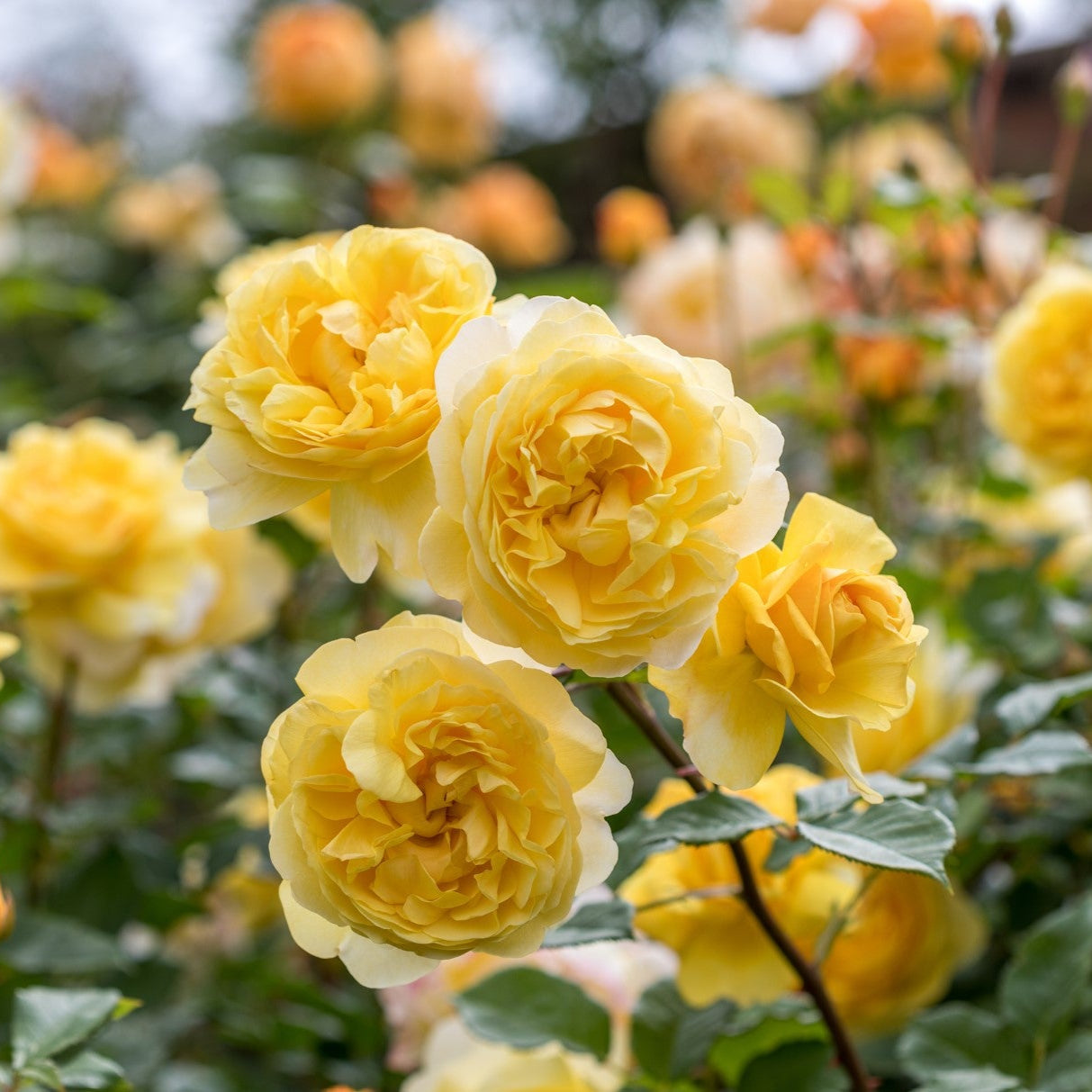 De The Poet’s Wife roos produceert ronde, volledig dubbele bloemen in een intens gele tint die naar buiten toe subtiel vervagen. De buitenste ring van bloembladen omsluit een informele, lichtgevende groep binnenste bloemblaadjes, wat zorgt voor diepte en speelsheid.