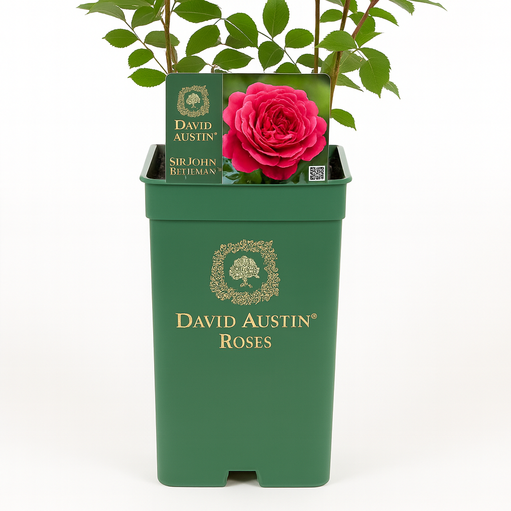 De Sir John Betjeman roos opent uit stevige kleine knoppen tot bolvormige bloemen in een intens diepe roze tint. De levendige kleur zorgt voor een opvallend contrast in borders en maakt haar een blikvanger in zowel kleine als grote tuinen.