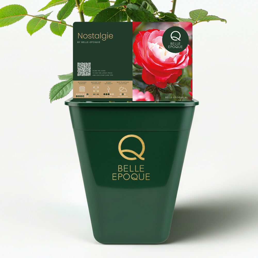 The large, cup-shaped flowers appear abundantly from June to October and spread a pleasant scent. Thanks to its healthy growth and strong, shiny leaves, Nostalgia is a low-maintenance choice for both novice and experienced gardeners. With a height of approximately 80–100 cm, this rose comes into its own as a solitary in the border, in groups, or even as a cut flower in a vase.
