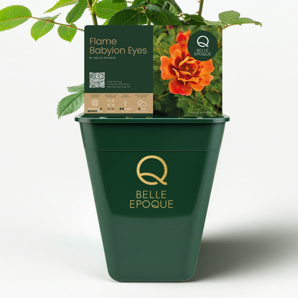 The Flame Babylon Eyes is a striking Persian shrub rose that brings warmth and vibrancy to the garden. The flowers display a playful mix of yellow and orange hues, enhanced by the characteristic dark red "eye" at the center. This unique interplay of colors makes Flame Babylon Eyes a real eye-catcher in borders or as a standalone shrub.