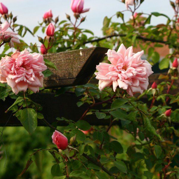 Rosa 'Albertine' (Barbier,1921) est une célèbre rose grimpante. Contrairement à la plupart des grimpantes, cette forte grimpeuse a de grandes fleurs. Rosa Albertine produit des masses de boutons floraux cuivrés d'où émergent abondamment des grappes de grandes fleurs doubles en forme de coupe de couleur saumon rose de 9 centimètres. Le dos de la fleur est rose corail, ce qui rend la rose particulièrement attrayante. C'est une rose grimpante particulièrement robuste avec une bonne résistance aux maladies qui peut atteindre jusqu'à 5 mètres de haut. Les feuilles sont vert foncé et brillantes. L'agréable parfum intense se répand dans tout le jardin. Elle fleurit une fois mais intensément et longtemps en juin-juillet. Un classique.