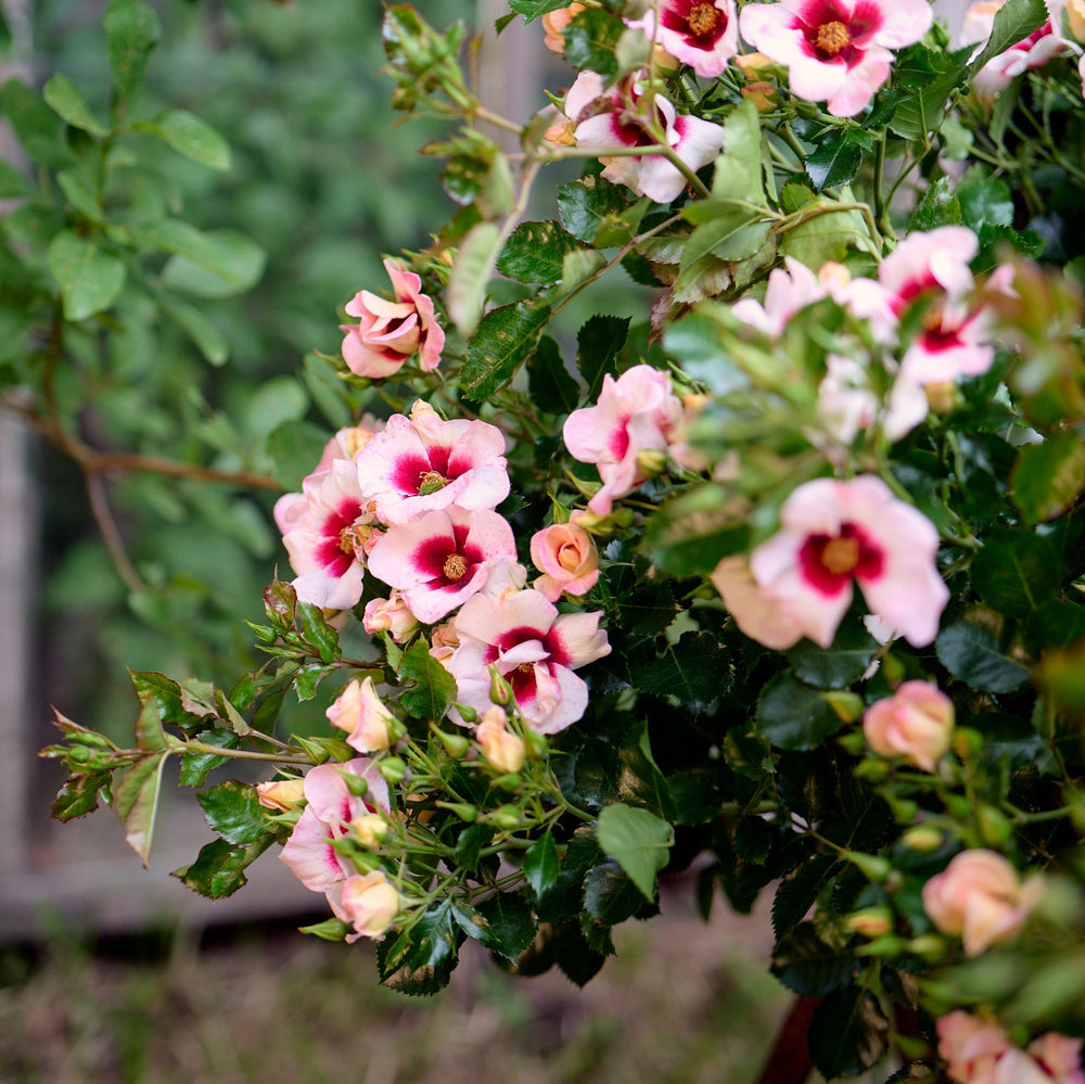 De Persica-hybride roos, zorgvuldig gekweekt door Belle Epoque, is een betoverende toevoeging aan elke tuin. Deze bijzondere roos valt op door haar eenvoudige, maar elegante roomwitte bloemen, waarbij het paarsrode oog een opvallend contrast biedt. De bloemen verschijnen in kleine trossen en bloeien rijkelijk door tot ver in de herfst, waardoor uw tuin seizoen na seizoen gevuld blijft met schoonheid.